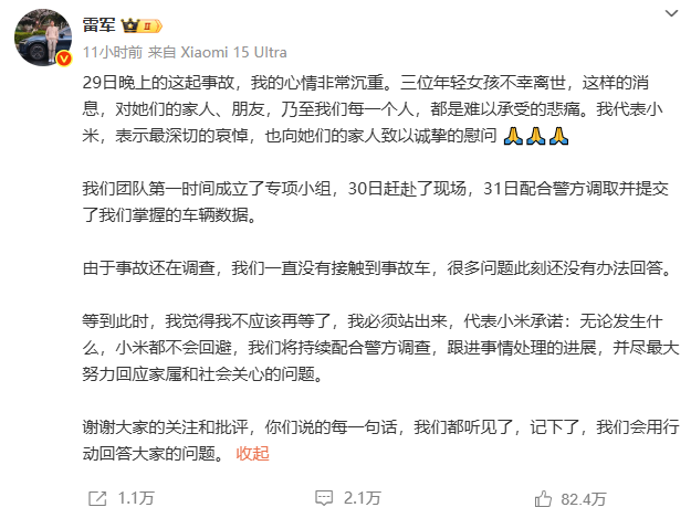 小米SU7高速碰撞事件后续:雷军首次发声与官方回应