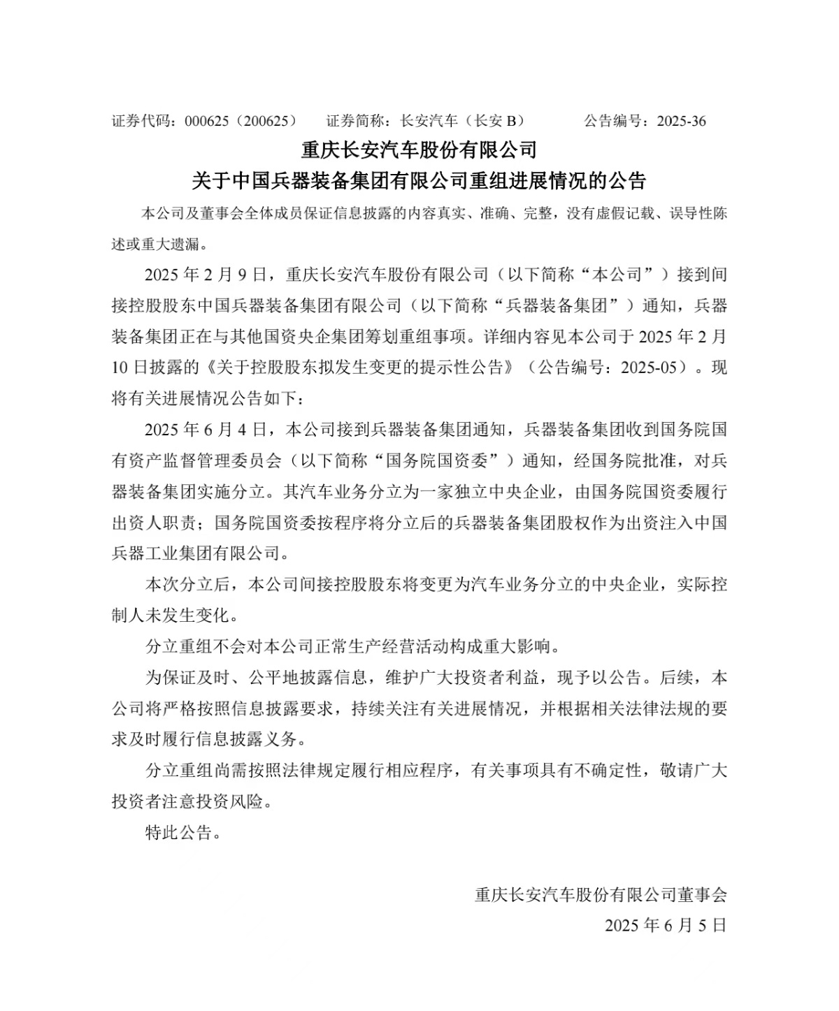 (长安汽车发布公告)