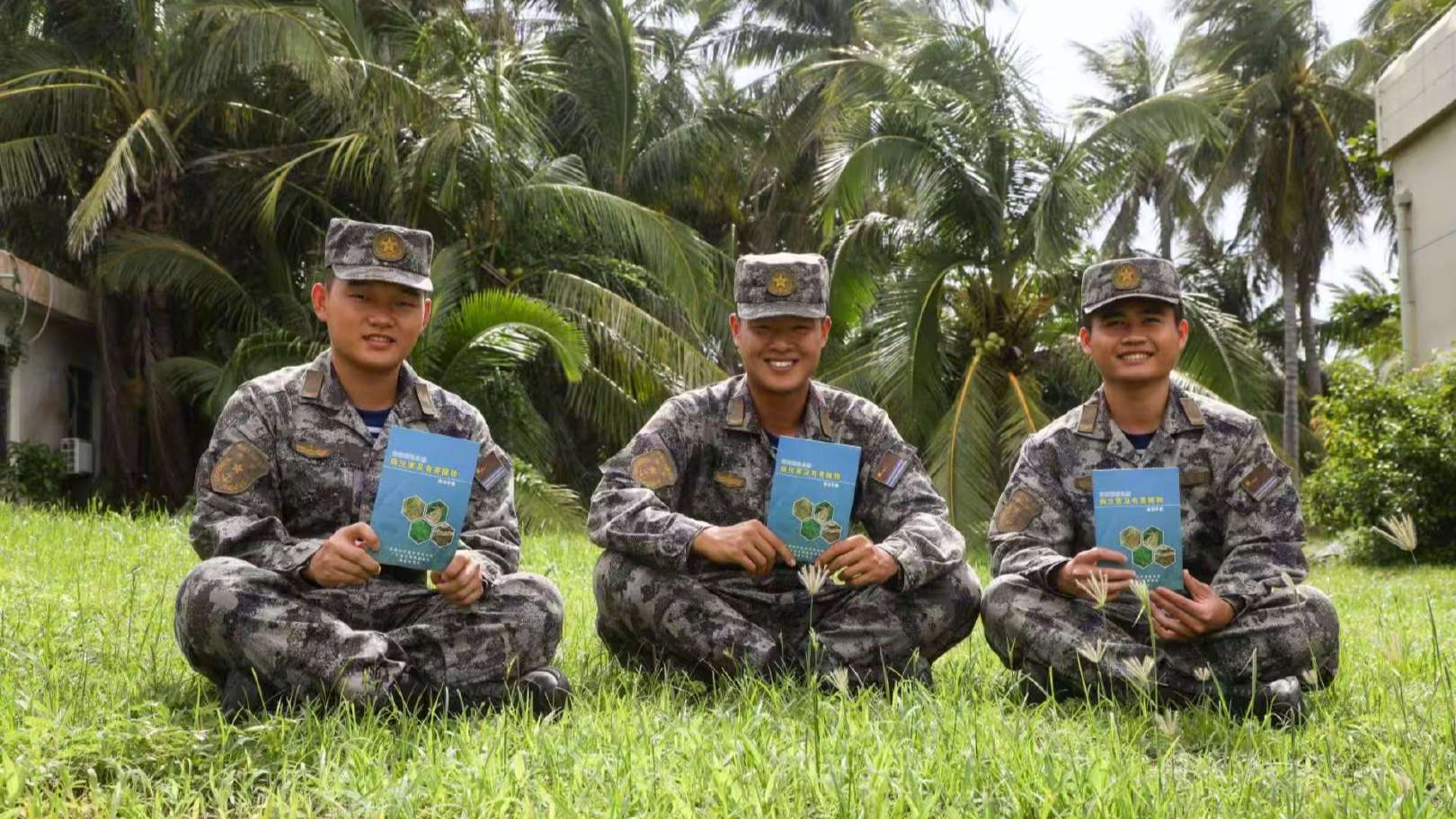 某海军南沙守备部队官兵正在学习新发放的环保手册。
