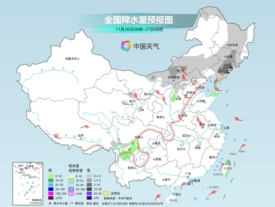 具体情况如下:中央气象台预测今日内蒙古中西部和东南部、山西北部以及河北北部、东北地区大部等地部分地区会有小雪或雨夹雪。此外,在内蒙古中部和西北部、吉林中南部以及辽宁中东部部分区域可能会出现中到大量级的降雪,局部甚至可能遭遇暴雪。 在其他地区,辽东半岛、山西中部、山东半岛、四川南部、云南西北部及台湾岛东部等地部分地区会下雨,其中有的地方可能会下中小雨。