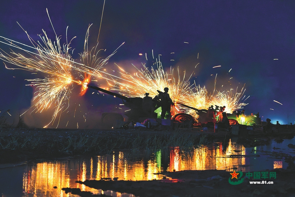 在夜间,弹射高炮分队攻击敌方目标。击训